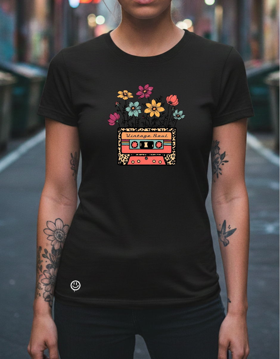 La música es un jardín que nunca deja de crecer. Este diseño presenta un cassette retro en tonos coral y mostaza, del cual brotan flores silvestres: Floral Beats. Es una metáfora visual sobre cómo los clásicos del ayer siguen floreciendo y dándole vida a nuestro estilo actual. Una prenda creada para quienes valoran la autenticidad de lo antiguo y la belleza de lo natural.