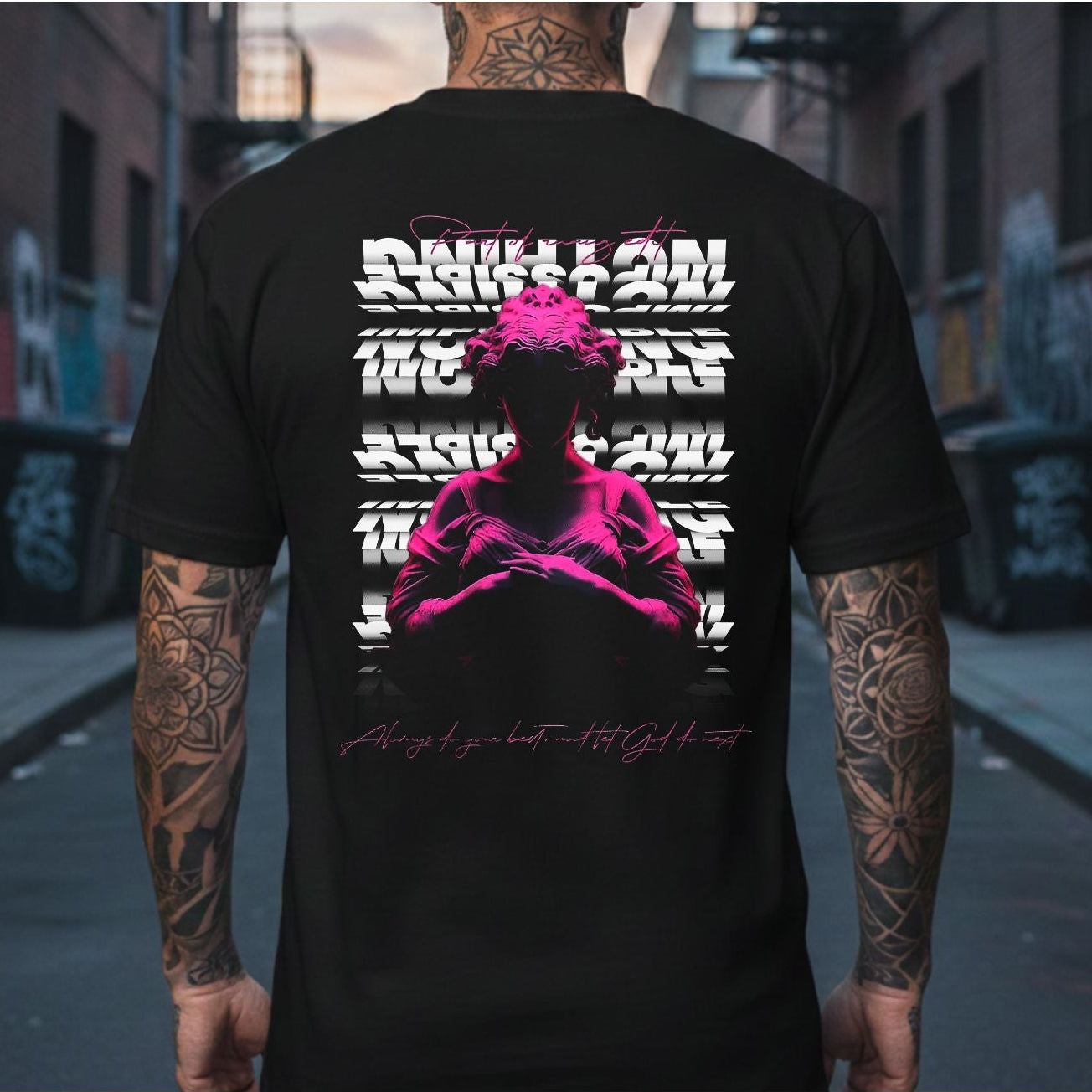 La disciplina se encuentra con la fe. Este diseño fusiona la elegancia de la escultura clásica con una estética digital vibrante en tonos magenta. Bajo el lema "Always do your best, and let God do the rest", esta pieza es un recordatorio visual de que el éxito requiere entrega absoluta, pero la paz llega cuando confías en el proceso superior.