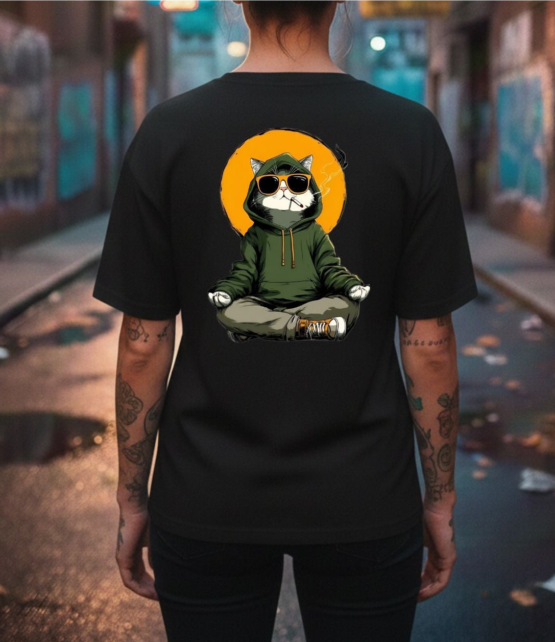Encuentra tu centro en medio del caos. Este diseño presenta a nuestro gato en meditación profunda, combinando la calma espiritual con la actitud urbana de la calle. Es un recordatorio visual de que la verdadera paz interior no significa estar en un lugar sin ruido, sino mantener la calma en el corazón de la ciudad.